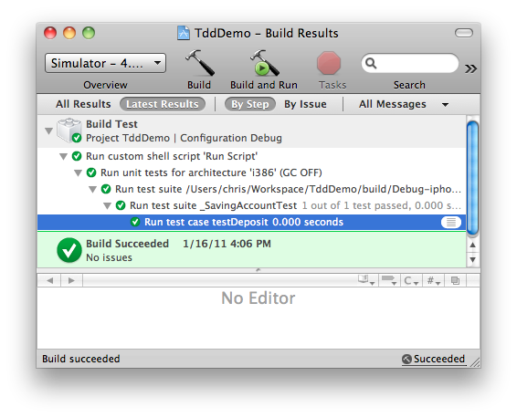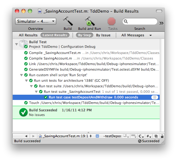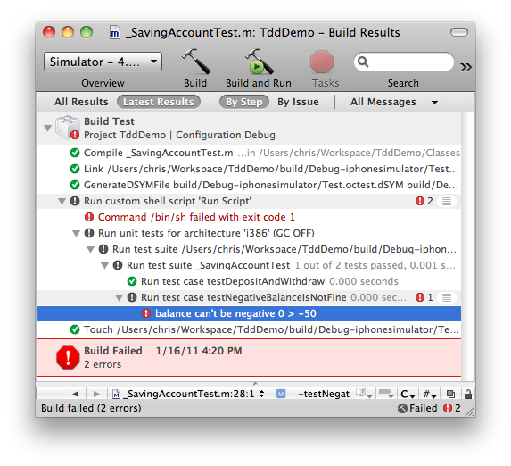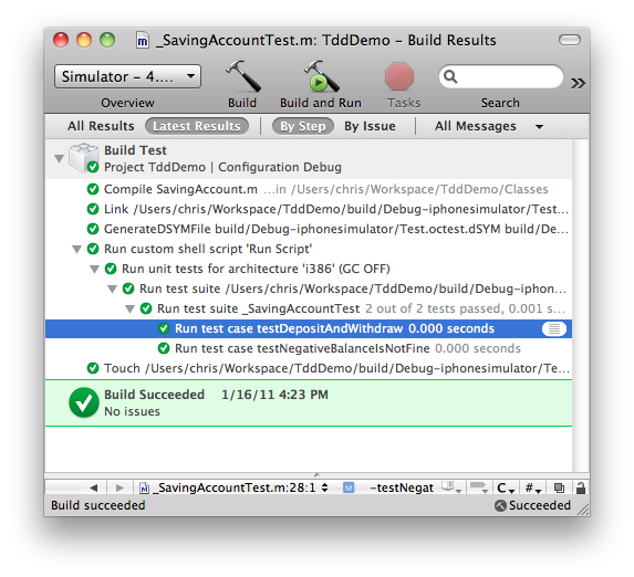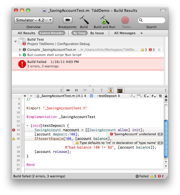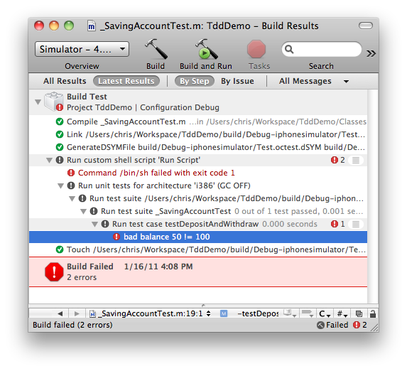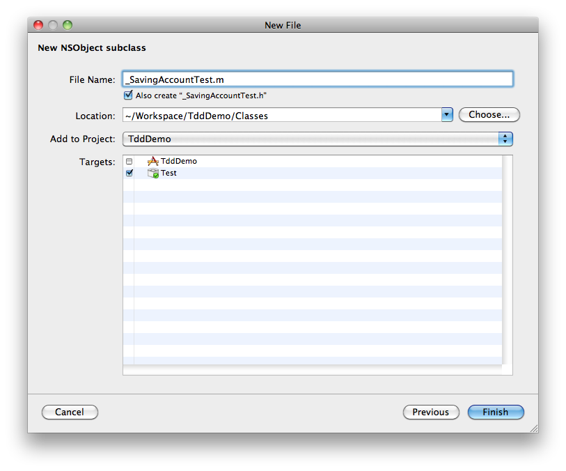Xcode 模版会缺省生成一个 TddDemo 的 target,这个是在 simulator 上跑的,我们需要添加新的 target Test,菜单 project -> new target -> Cocoa -> Unit Test Bundle。具体设置可参考这篇博文。